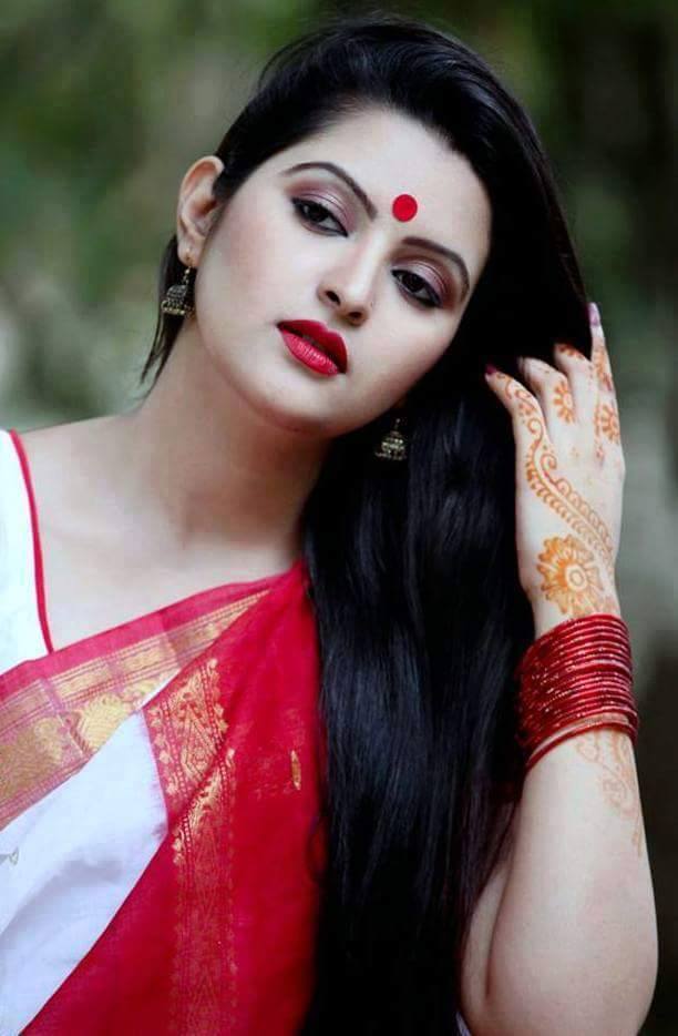 Wearing White red Sari, Bengali Beauty